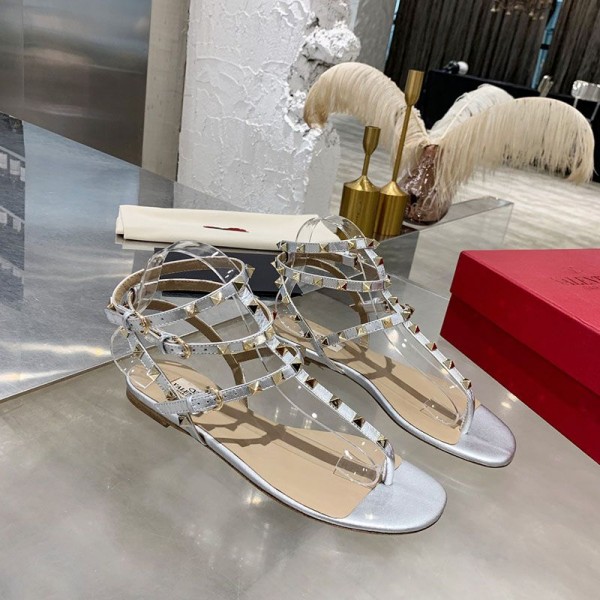 Valentino Garavani Rockstud Flat Flip-Flop Sandals Women Calfskin Silver