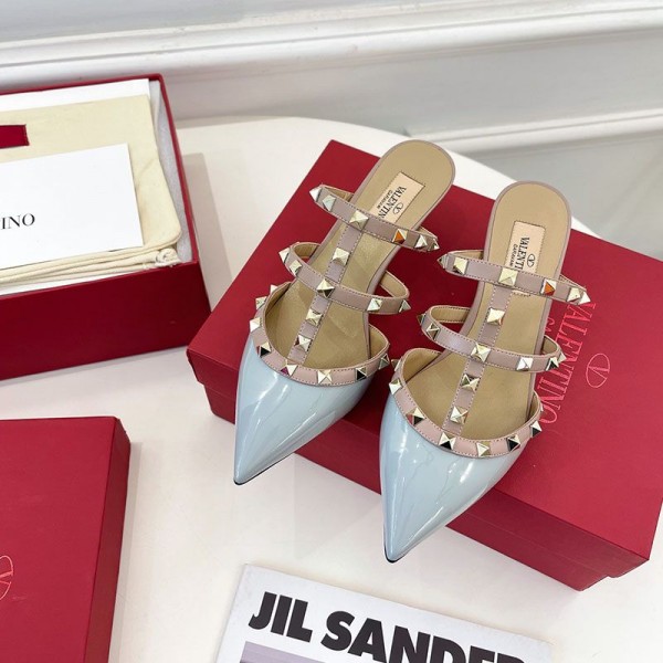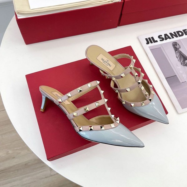Valentino Garavani Rockstud Heeled Mules with Straps Women Patent Leather Sky Blue