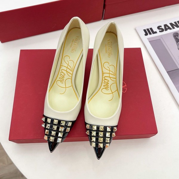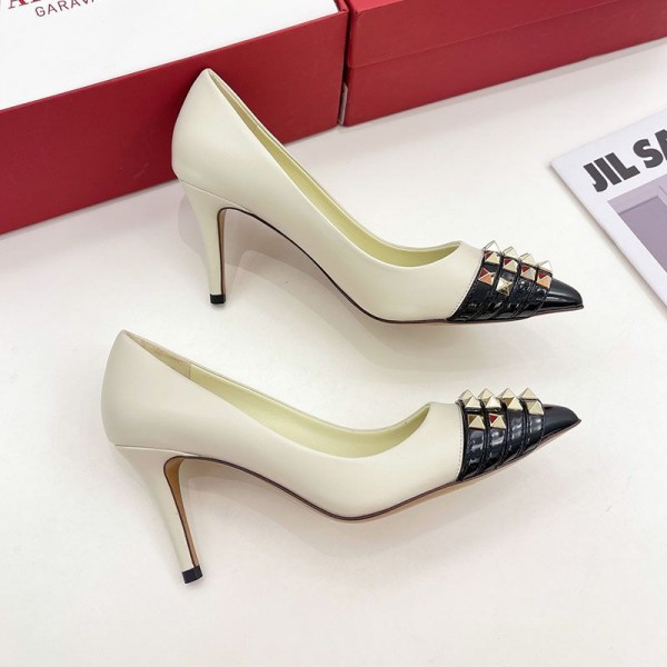 -White/Black Rockstud Pumps.